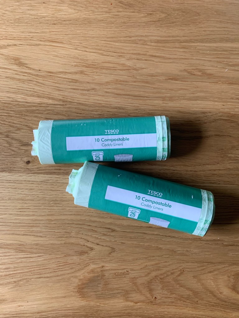 Tesco 20 compostable caddy liners tie-top & Zero Waste Club Biodegradable Sponges 2 Pack: both from Tesco