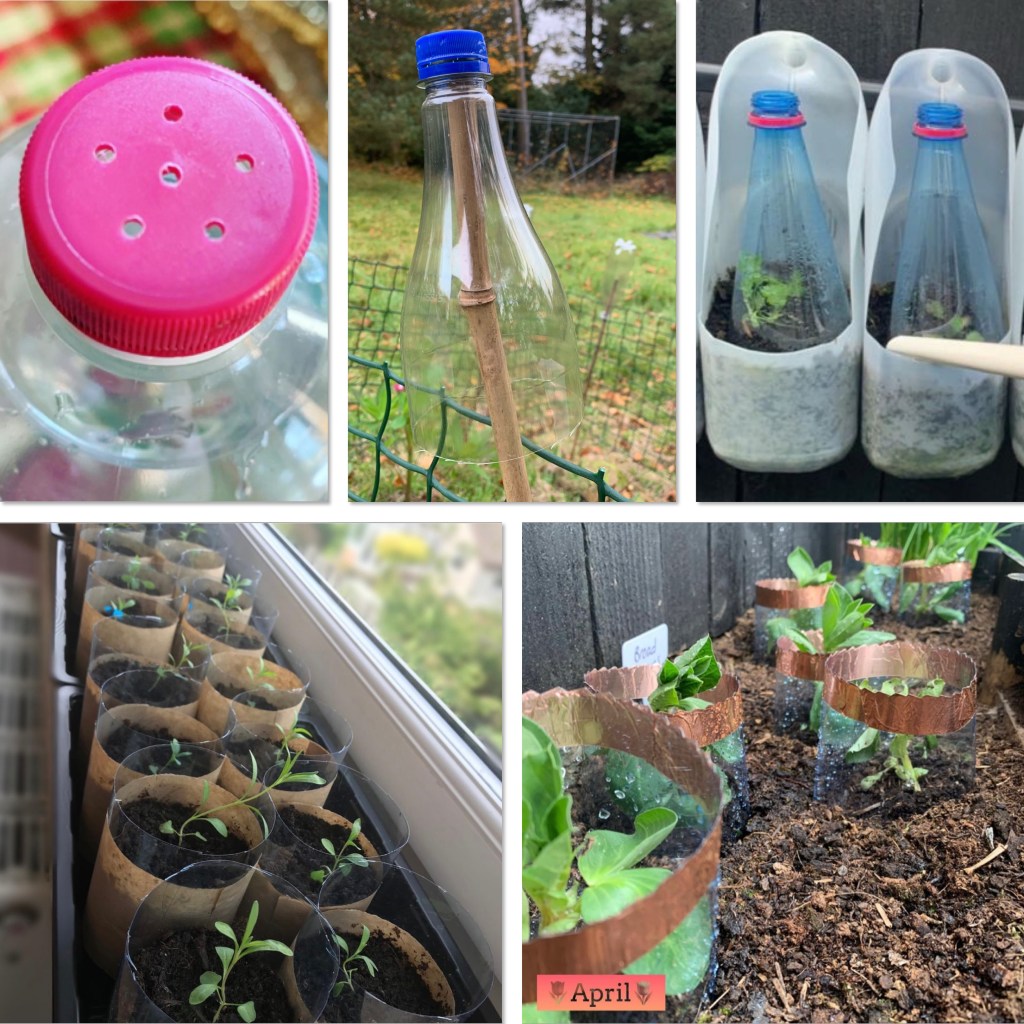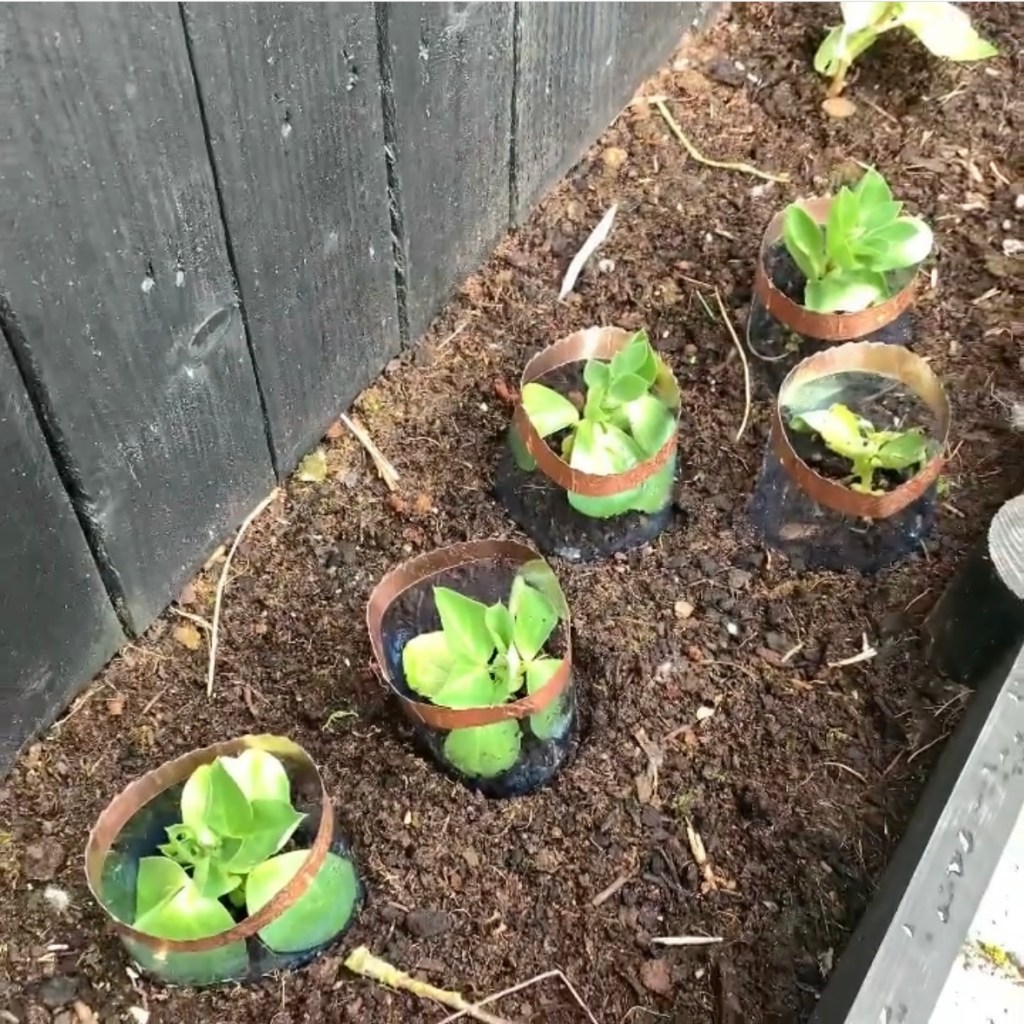 Made cuffs with a middle section to stop the slugs on small seedlings. Cut the middle of the fizzy water bottles. Put sticky copper tape around the top & used pinking scissors to cut around the top so its sharp for slugs to go over.