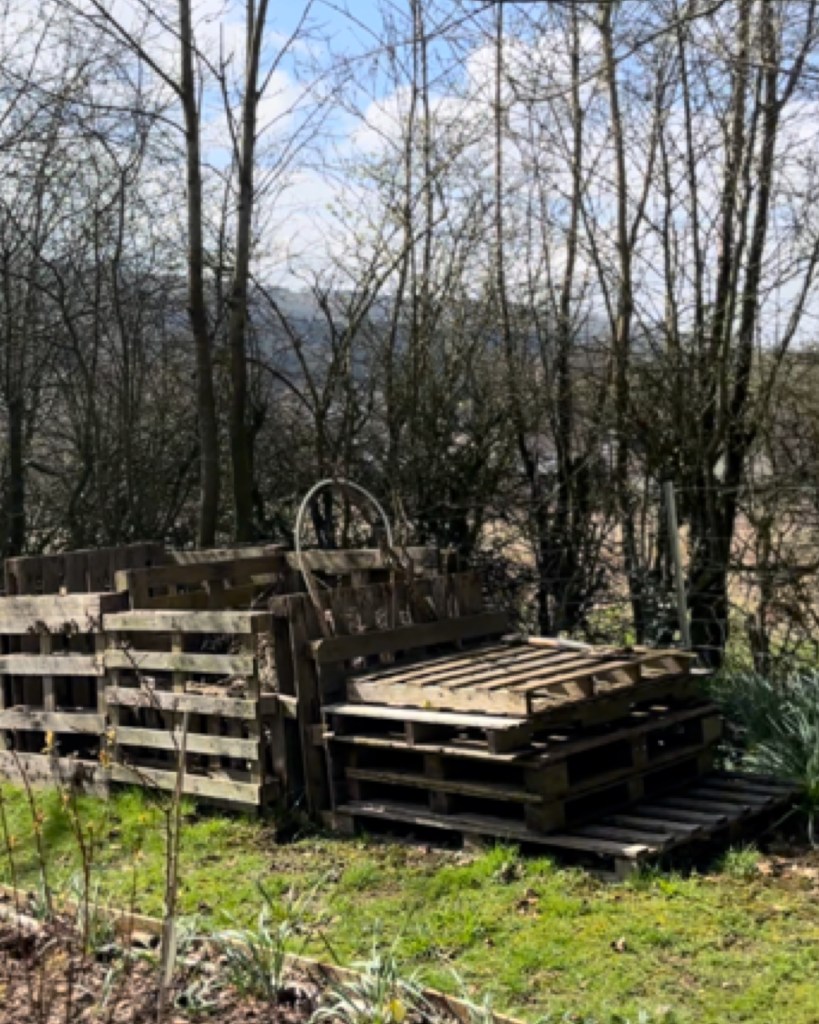 Scrap Wood & Pallets: Wood left over from fencing & part of the large fruit cage that was never used & free pallets we’d collected from around the village. These pallets do take some time to get apart & remove the nails, but worth the effort.