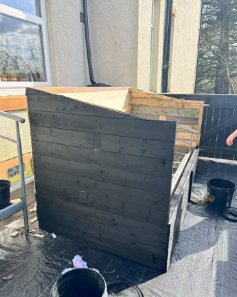 Painted using left over black fence paint to cover it all. Eliza spent the afternoon with me doing this.