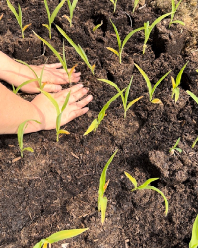 After a few weeks when the sweetcorn is a good 15-20cm tall we transplant them into the positions they will grow