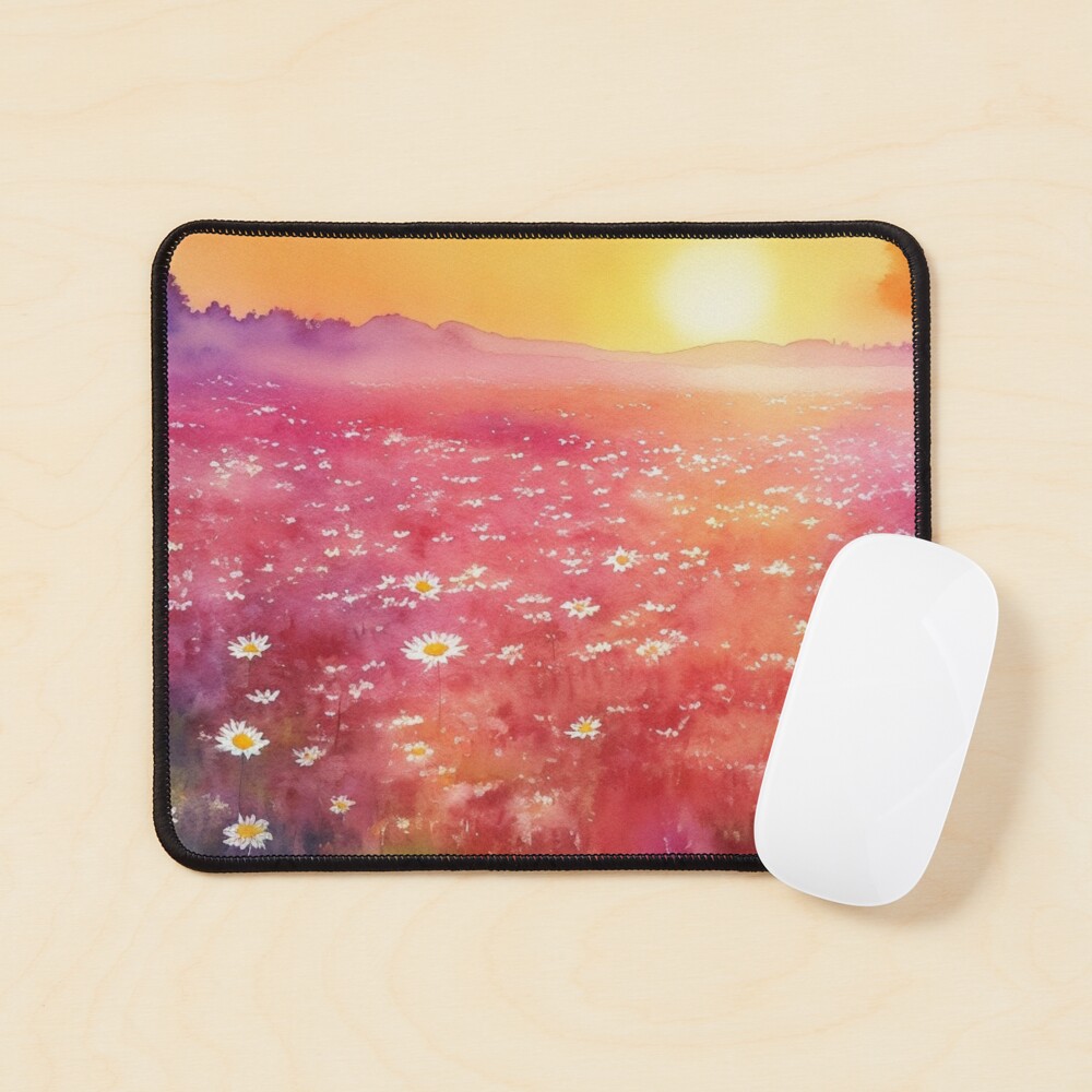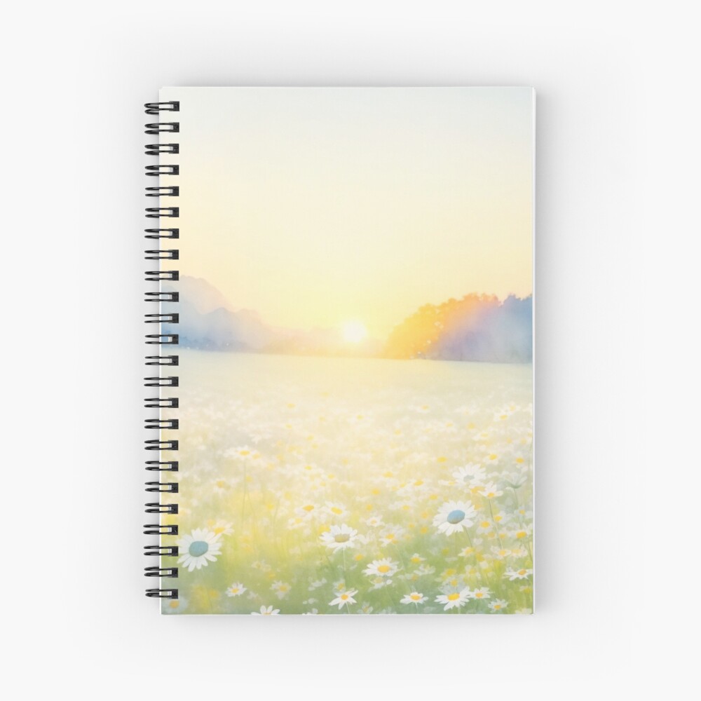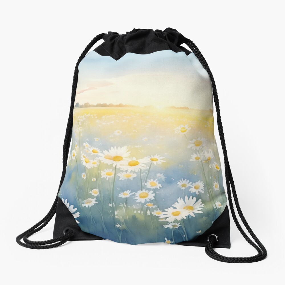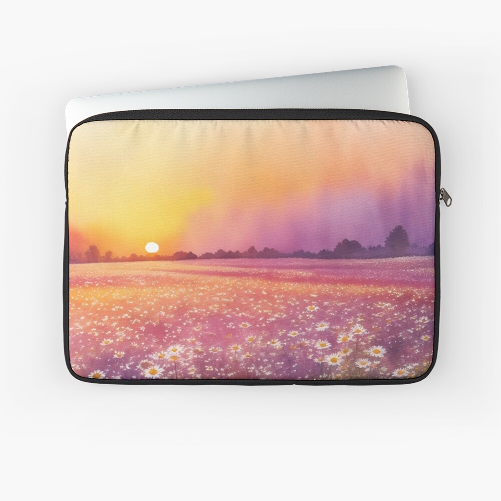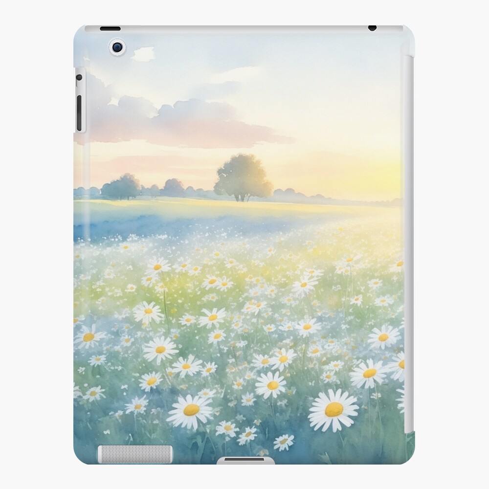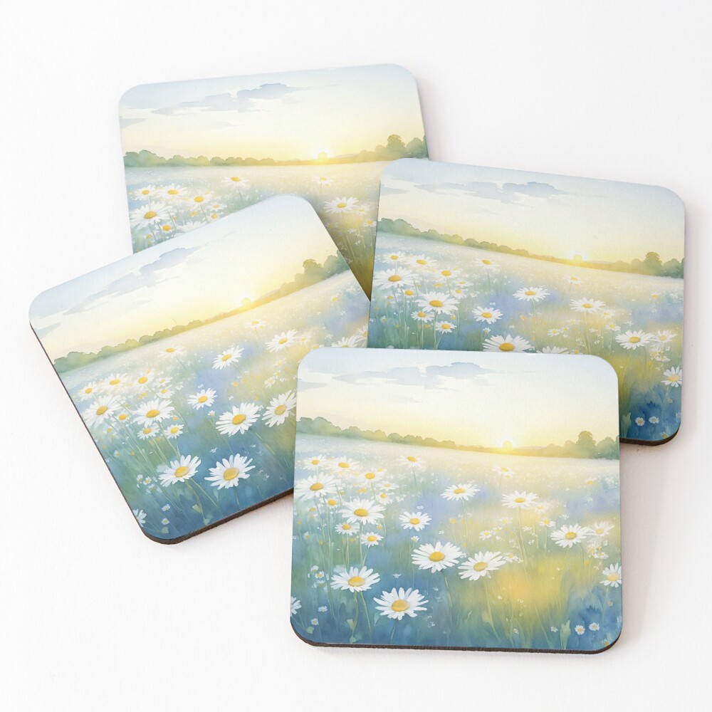 Field Of Daises Collection. 8 designs over 2 tones, a morning sunrise with soft blues and yellow tones and an evening sunset with striking reds, orange and yellows fill the skies across these beautiful fields of daisies