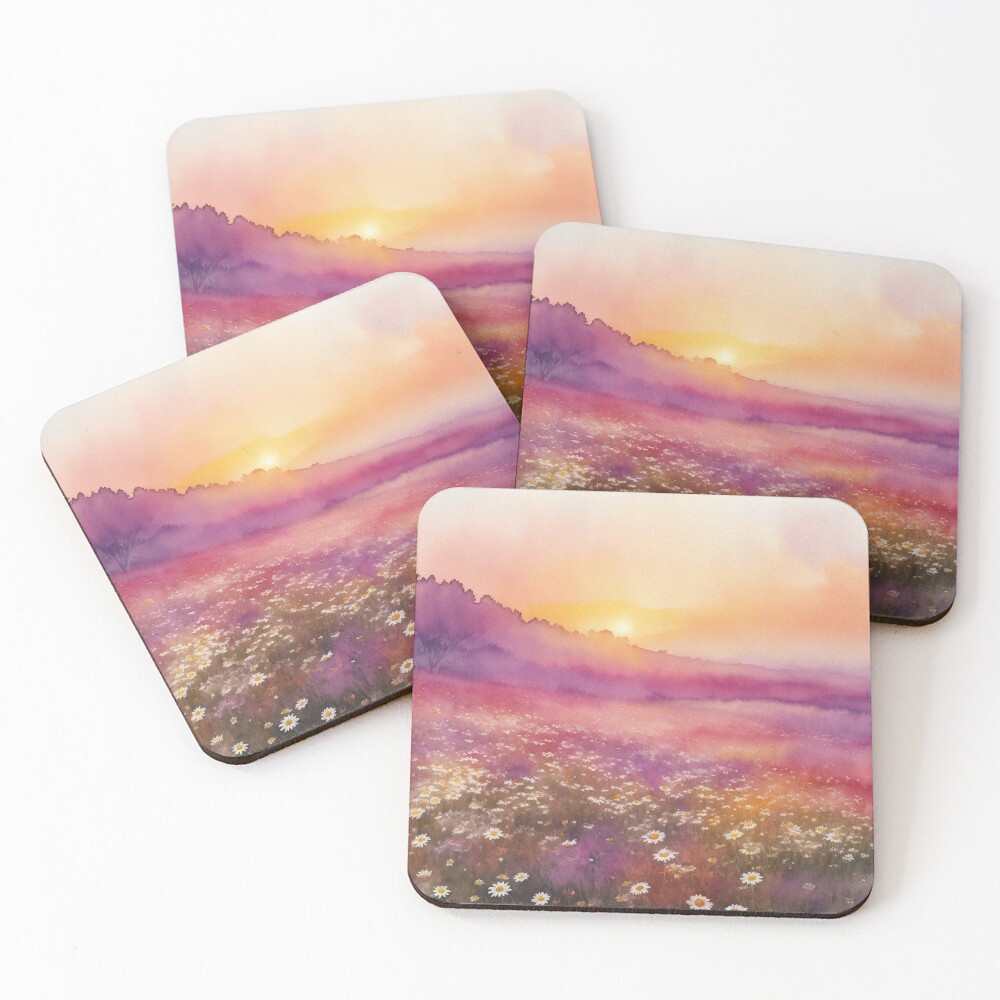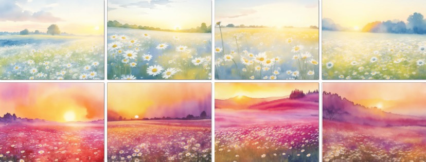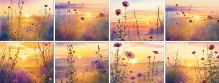 Wildflowers Collection. 8 designs a morning sunrise with soft orange and yellow tones with a hint of reds, purples and blues fill the skies across these beautiful wildflower fields.