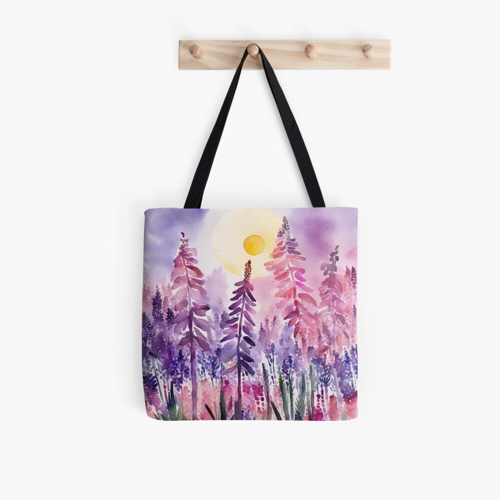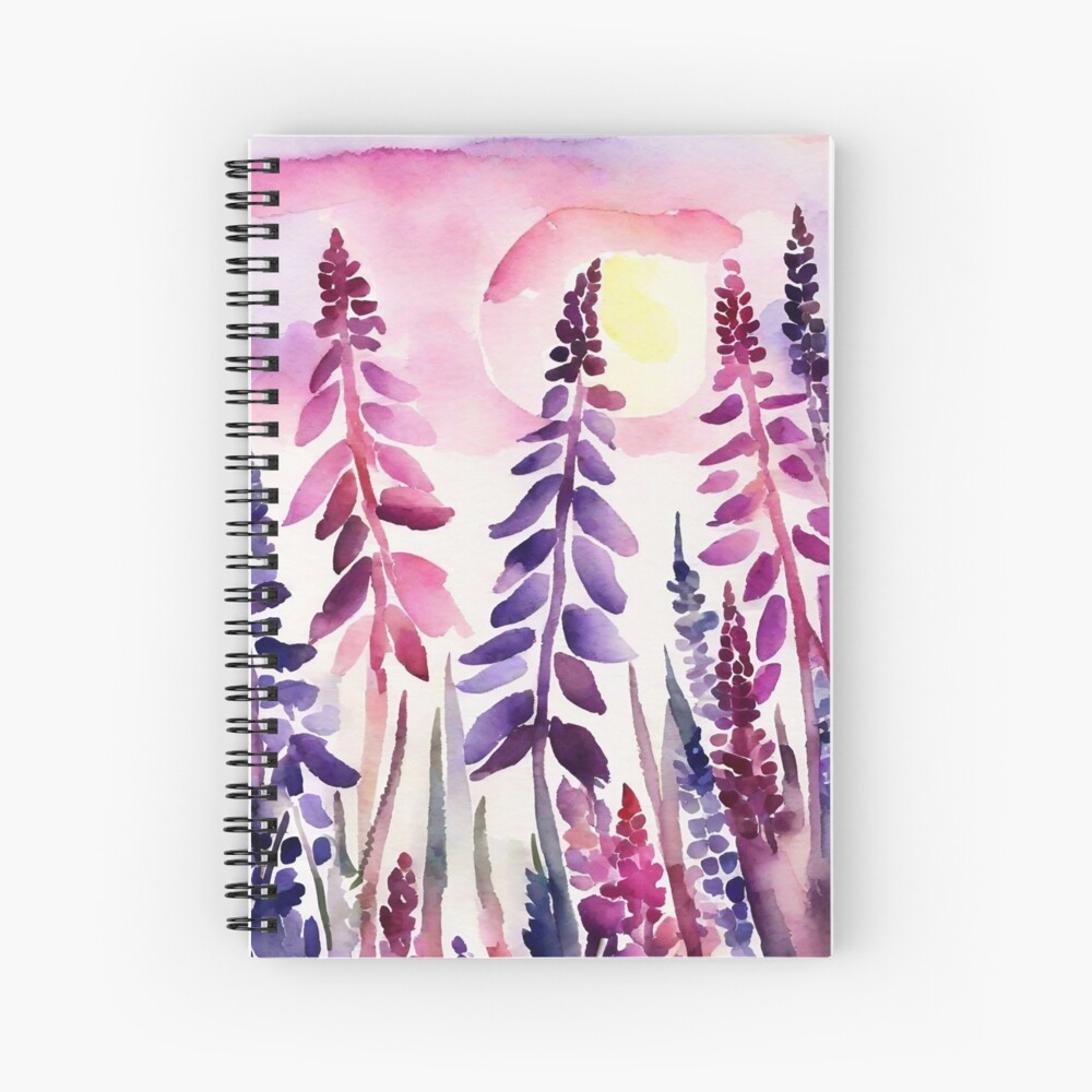 Lupin Garden Collection. Bold watercolour strokes style design, with vibrant hues of purples filling the evening sky, and across the lupins. Beautiful tones changing across the 8 designs as the sunset fades into the distance.