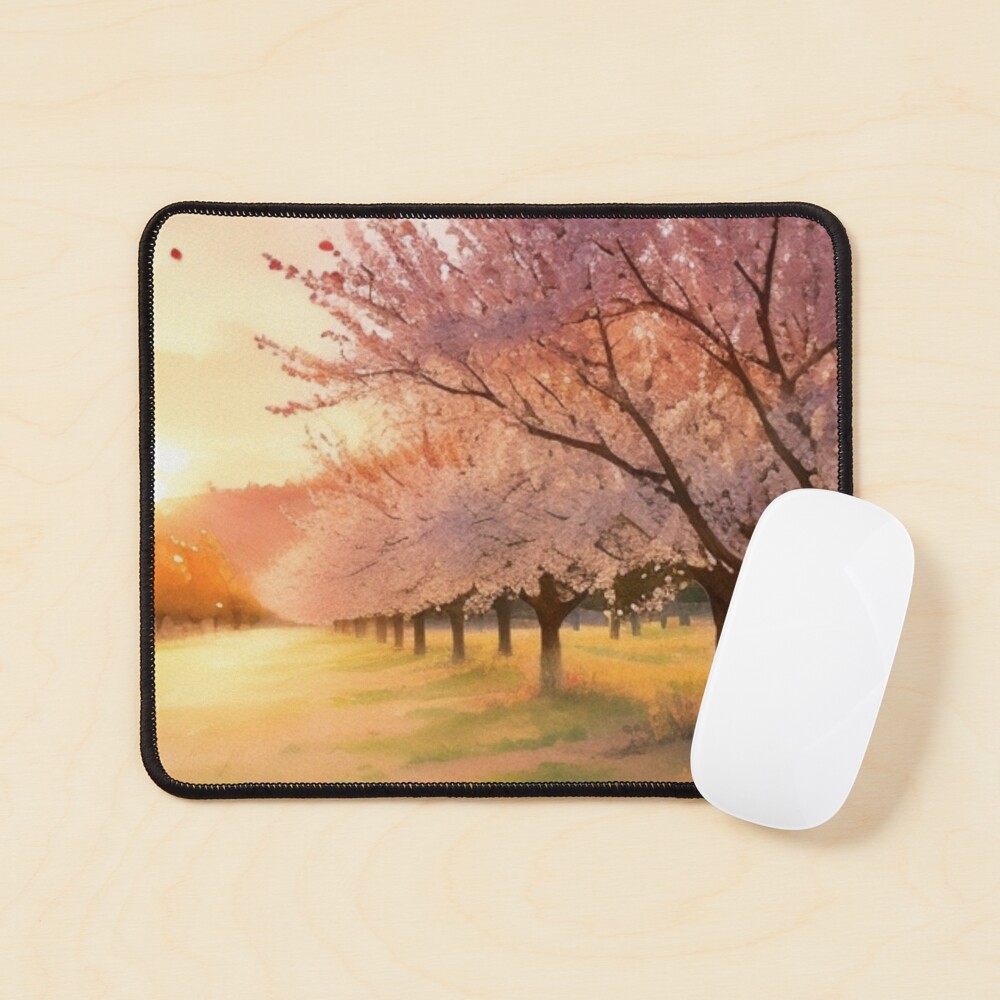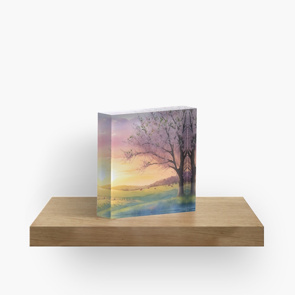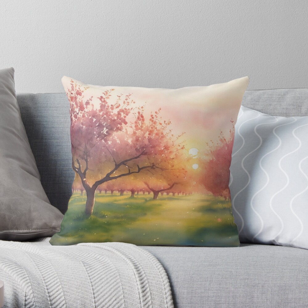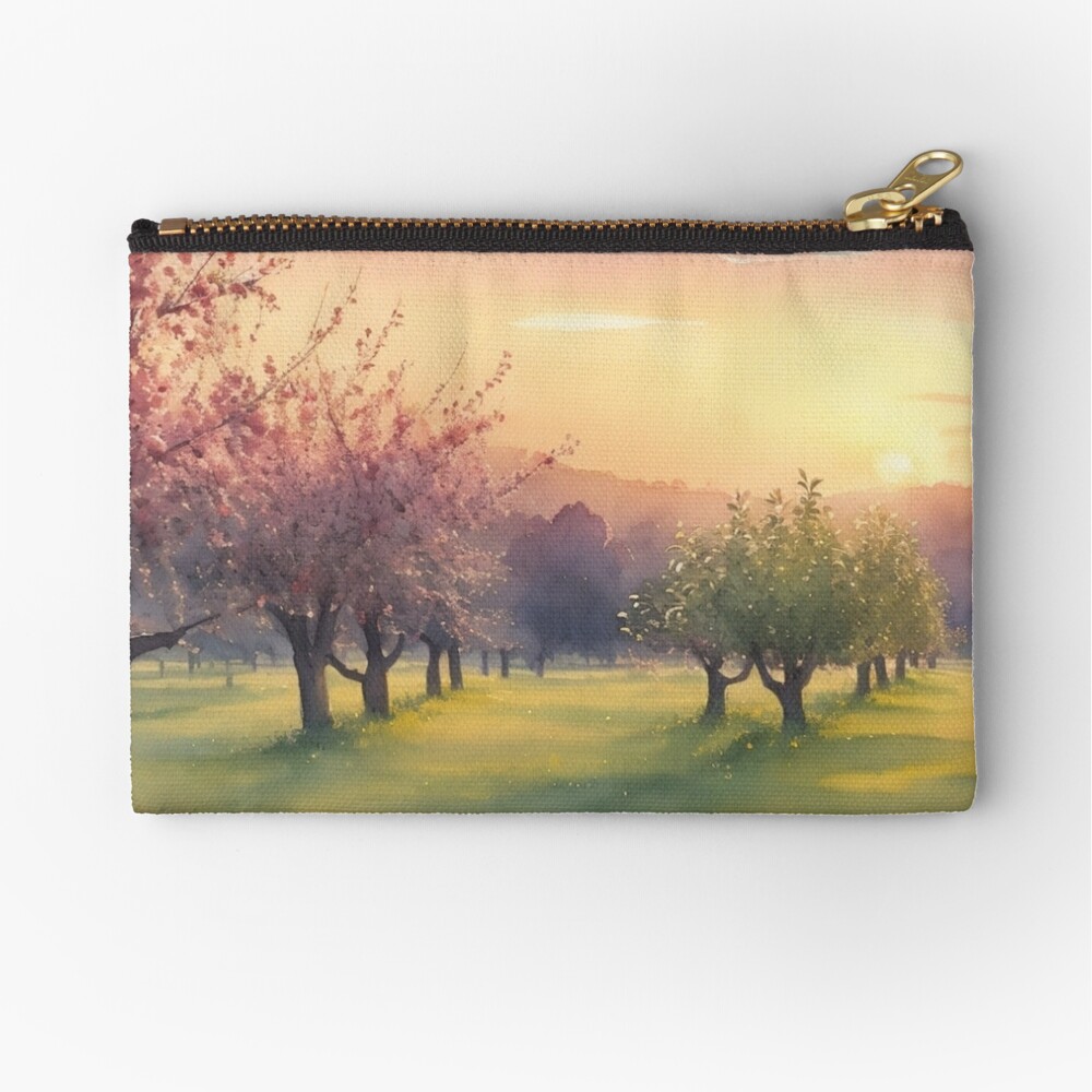 Apple Orchard Collection. Soft watercolour style designs overlooking different angles a an apple orchard fields across the 8 designs on a beautiful evening sunset. Yellow, oranges and soft pinks lighting the sky and clouds and the soft pink of the apple blossom on the trees. A Beautiful Summers evening.