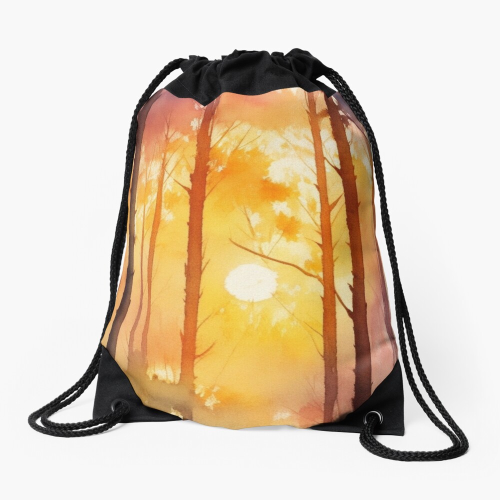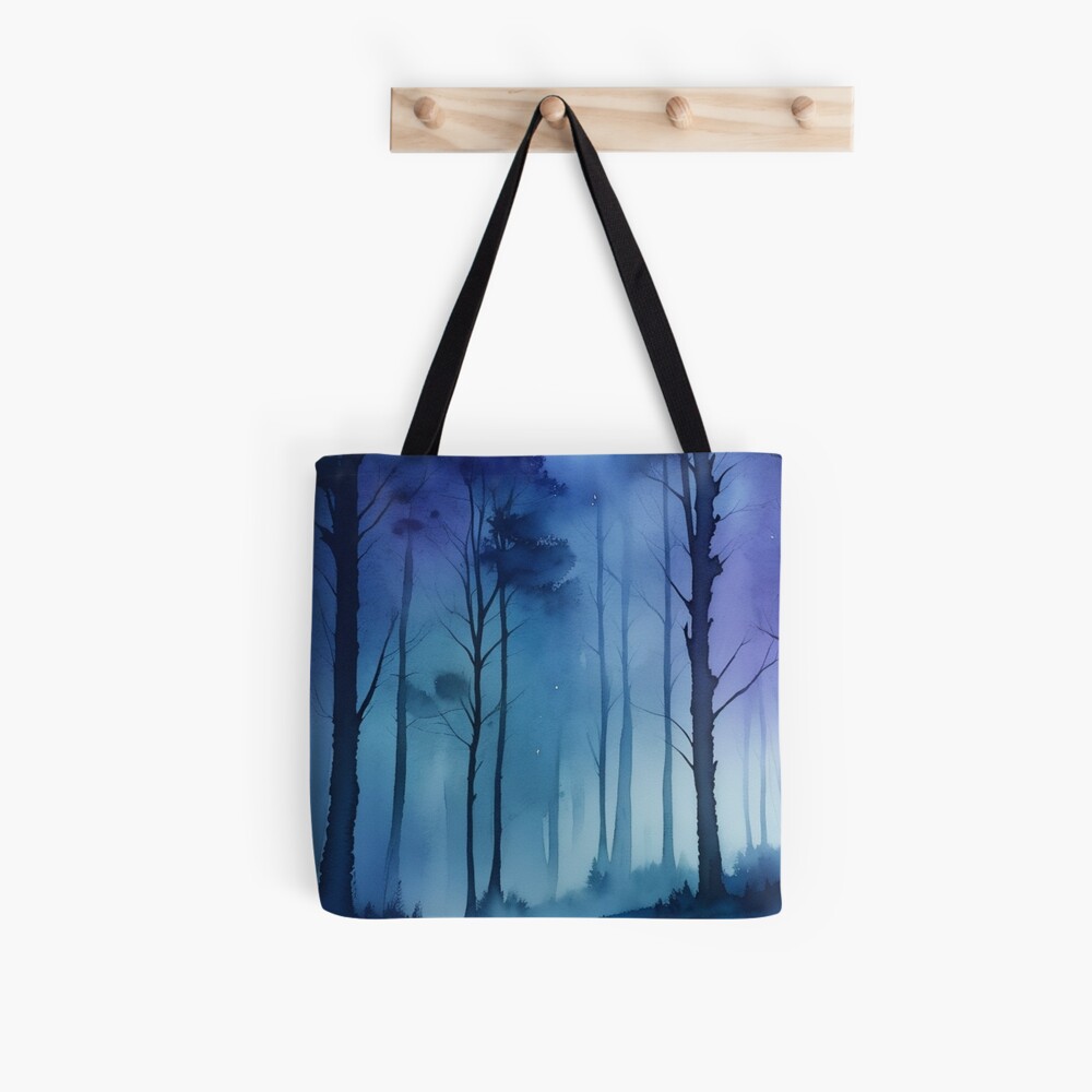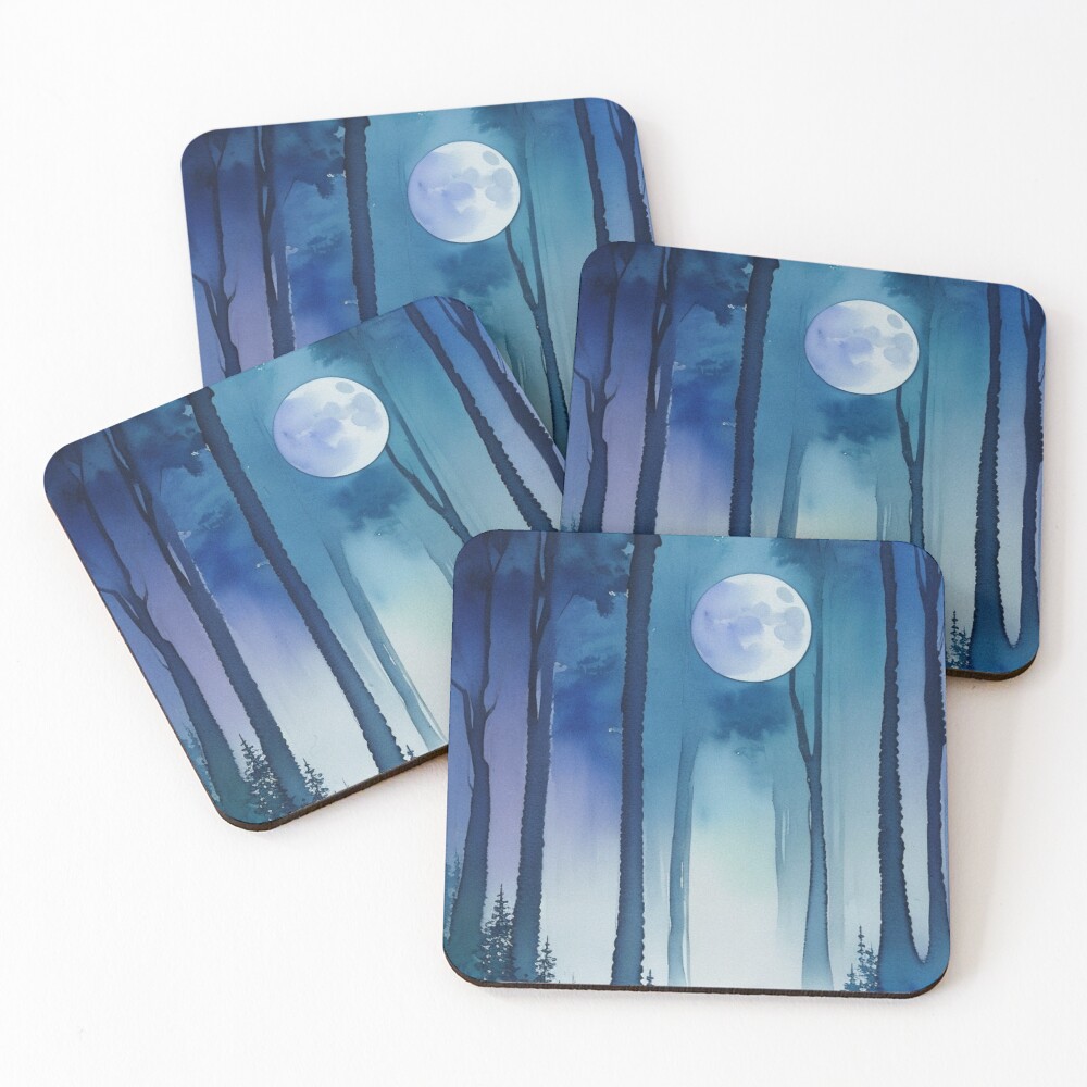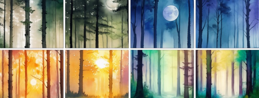 Forest Collection. Bold watercolour strokes style design, with vibrant hues of greens, blues, golden yellows, soft yellows fill the sky at different points of the sunset as the moon starts to appear.