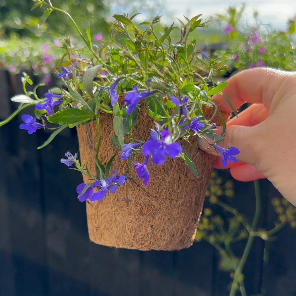 We are using 10″ coir pots here, the coir absorbs the water so you don’t dry out and hold some moisture a little longer for you. We use coir products for our pots.