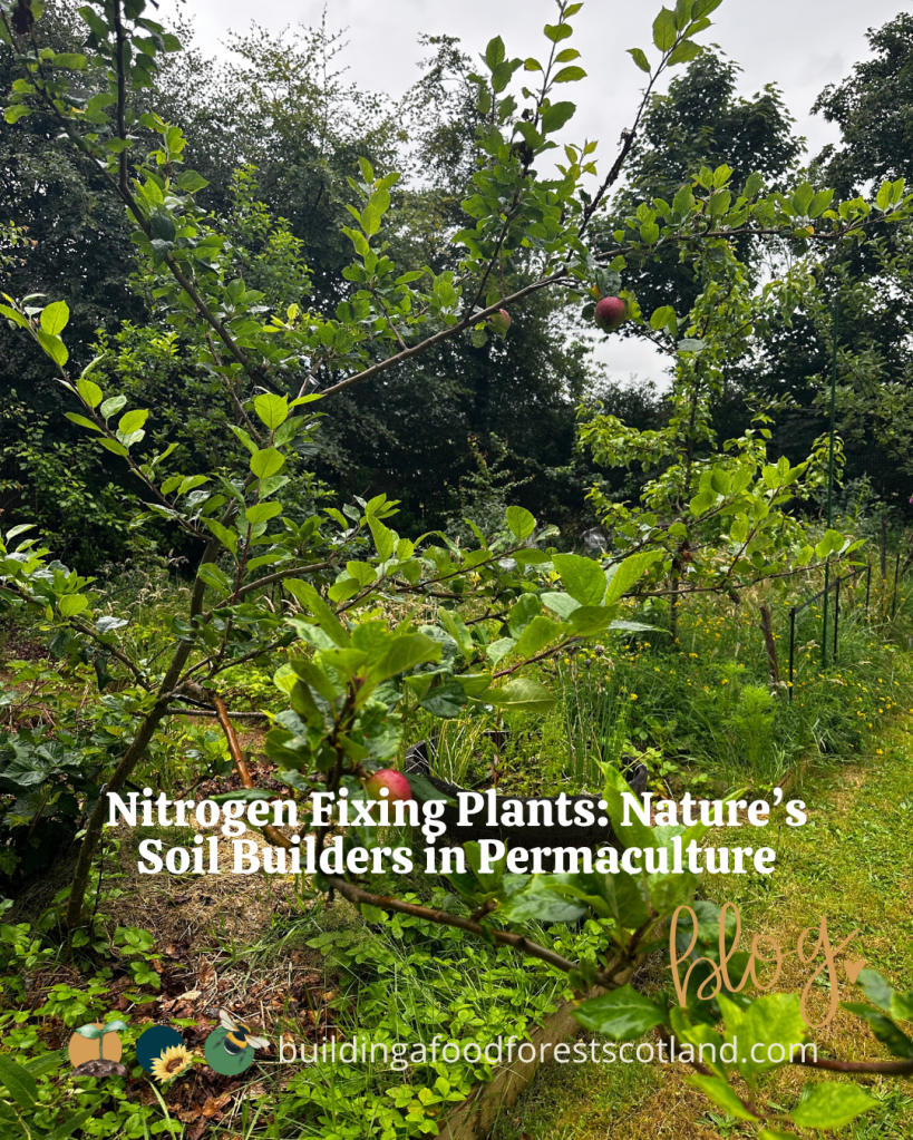 Perennial nitrogen fixing trees and shrubs can be interplanted throughout a food forest. These are examples of what we are using in our food forest in Scotland: