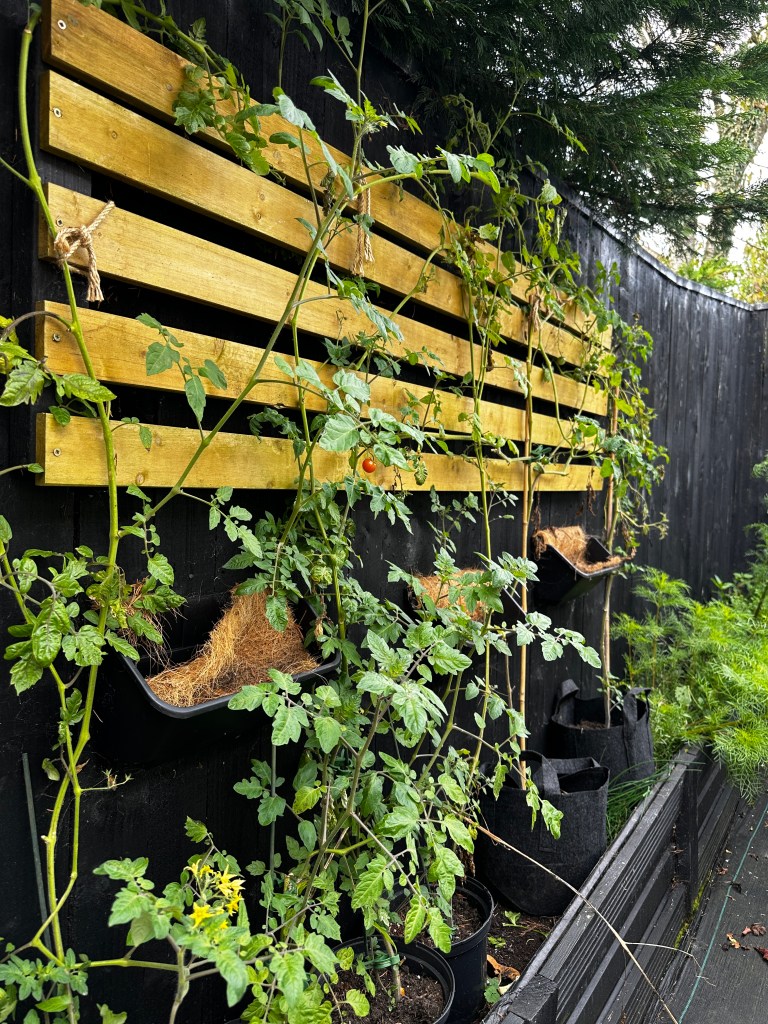 Salad greens continue to provide, though more slowly than in summer. Mixed leaves, mustard greens and rocket, while late sowings of spinach begin to establish themselves. Last of the mini tomatoes growing up the fence.