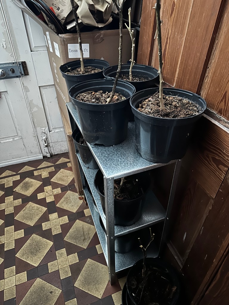Our Peppers, Chills and Aubergine plants all Winter pruned and tucked away in our porch with a load of cardboard we’ve collected to go out.