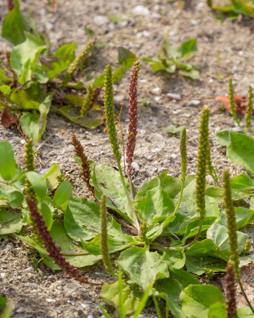 Broadleaf plantain is a low growing perennial plant that forms a rosette of wide, oval leaves close to the ground. It thrives in a variety of environments but is especially common in areas that experience regular foot traffic.