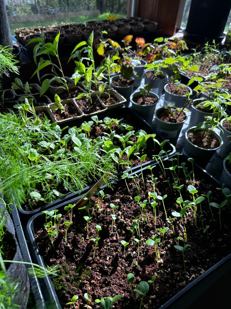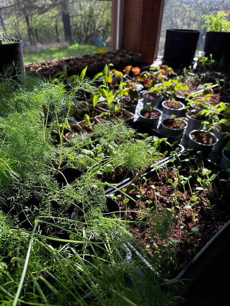 Indoors, the growing space is packed as seedlings are potted up again before beginning the transition outside more details on this blog here: Why It’s Essential to Harden Off Your Plants Before Planting Out