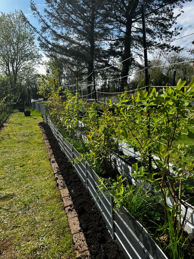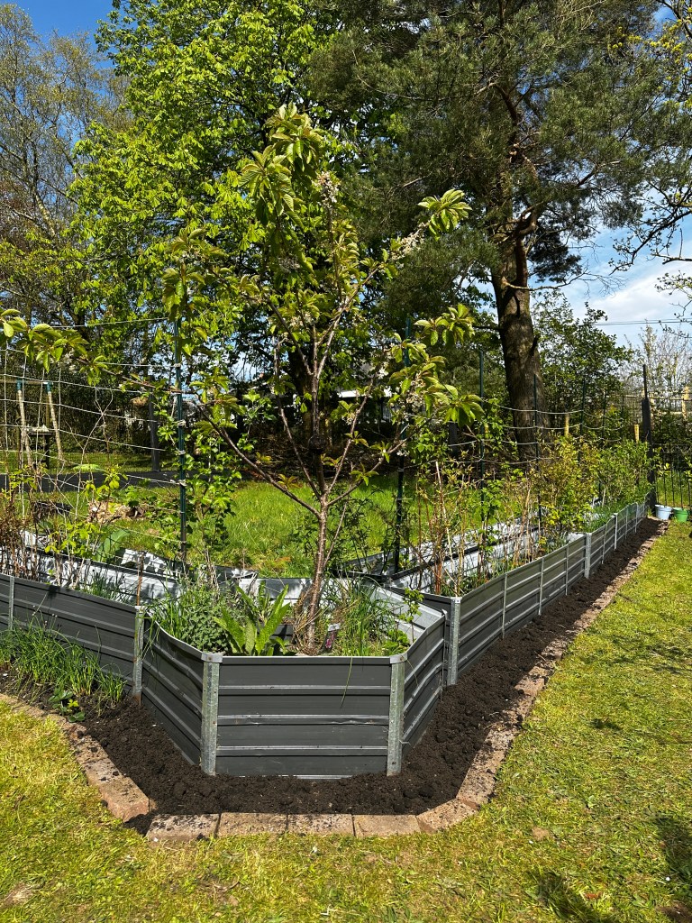 We’ve continued adding edging to the front of the raised bed paths, using reclaimed bricks we picked up for free on Facebook Marketplace. These not only give the space a more defined, structured look but also serve a practical purpose. Along the edges, we’ve planted chives—bringing a soft texture and pop of colour, while also acting as a natural pest deterrent within the beds. The brick edging helps create a clear boundary, stopping long grass from creeping in and making mowing and general maintenance far more manageable. It’s a simple addition, but one that saves time, improves the growing space, and ties the whole area together beautifully.
