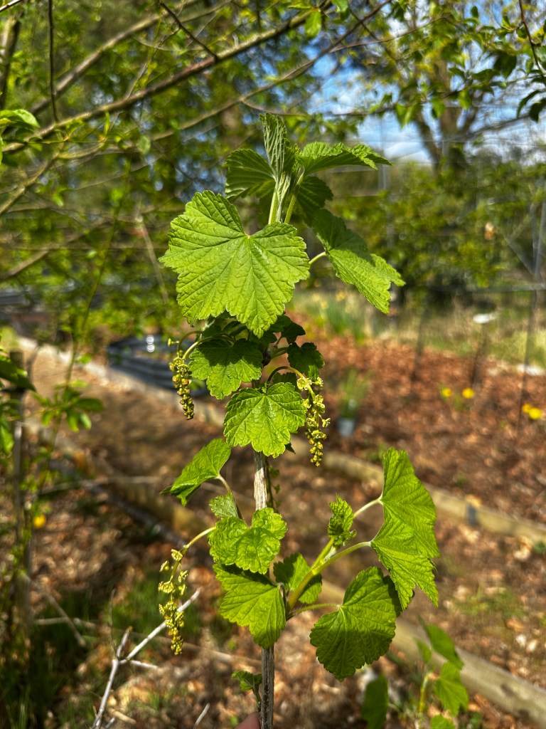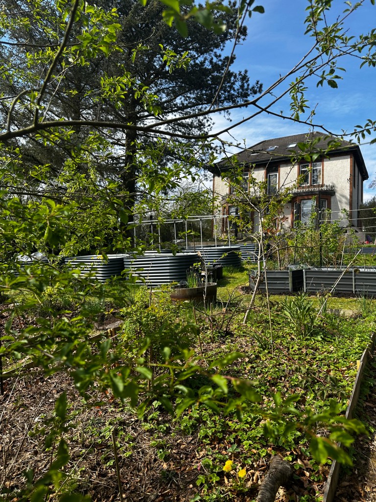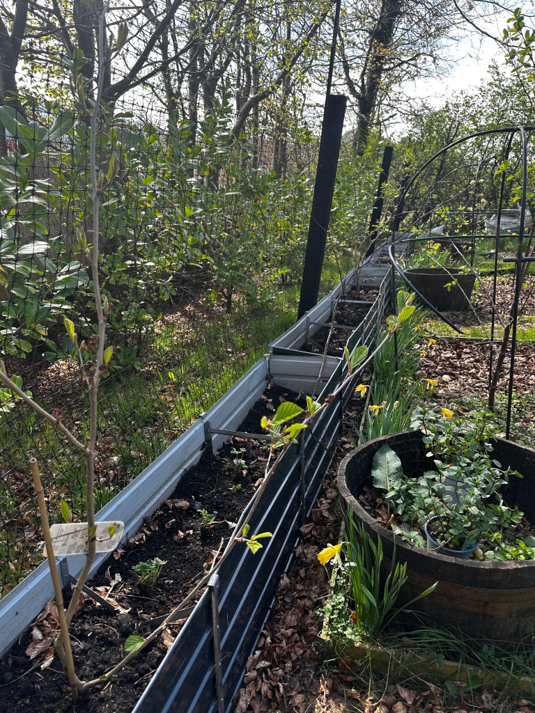 The new planting from earlier in the season is beginning to settle in. The hollyhocks along the fence line are establishing themselves, their leaves pushing upward with quiet determination, while the witch hazel, flowering currant and forsythia are starting to settle in and leaf up bringing structure, colour and early interest to the space. Together, they are shaping the edges of the food forest, softening boundaries and building layers within the system.
